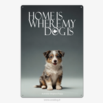 La targa Australian Shepherd Puppy porta un tocco di allegria e design in ogni ambiente. Realizzata in alluminio resistente alle intemperie, raffigura un simpatico cucciolo di Pastore Australiano accompagnato dalla frase “Home is where my dog...